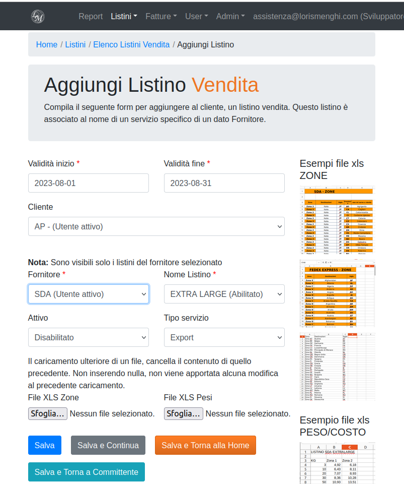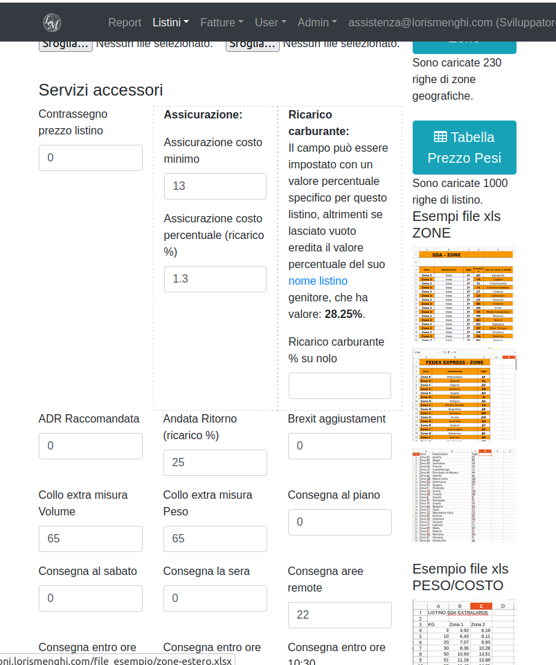 Si inserisce il periodo di validità nei 2 calendari, si seleziona il "Fornitore" (corriere), ed in automatico, la tendina con il "Nome Listino" verrà popolata solamente con i nomi dei differenti servizi del corriere scelto. Si possono subito caricare i 2 file: quello delle zone e quello dei pesi, con i formati messi anche in esempio nella interfaccia del sistema, ed una volta salvato, si potranno definire anche i costi extra accessori per quel listino.