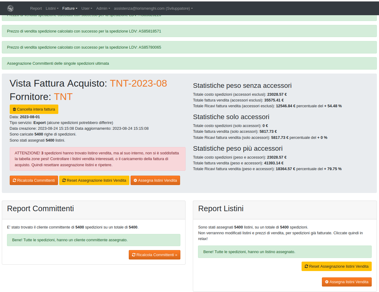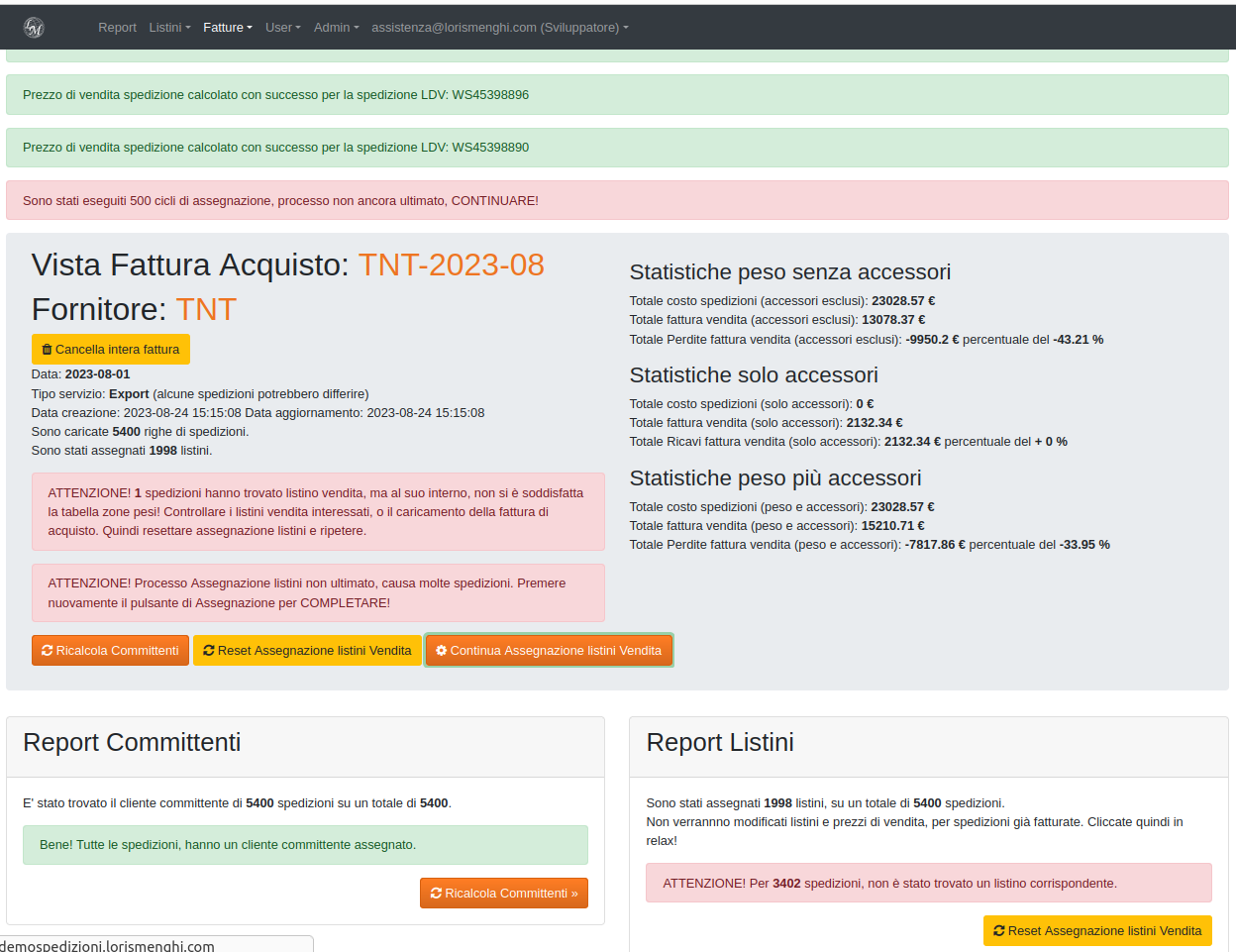 Ora che i committenti sono assegnati, premiamo il pulsante "Assegna listini vendita" il sistema cercherà di applicare i listini di vendita, mettendo a report eventuali problemi riscontrati, come nome o alias listino non trovato, oppure nome listino trovato, ma destinazione o capienza peso non soddisfacente il listino vendita.