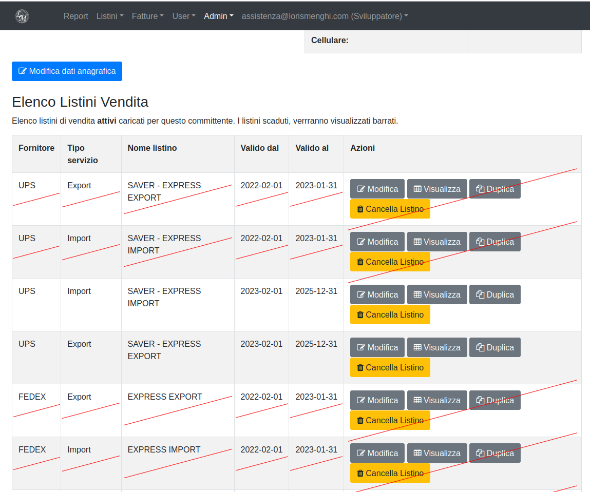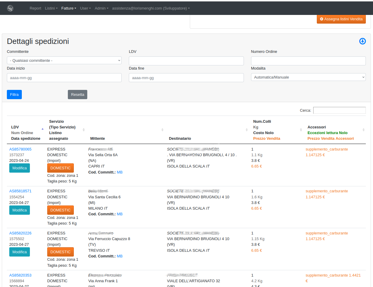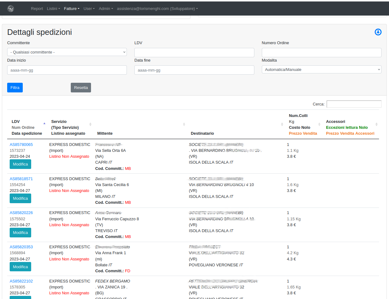 Alcune spedizioni potrebbero non riuscire a trovare l'associazione perfetta per motivazioni varie, un codice cliente passato errato, un peso fuori listino o un nome servizio non trovato. Si può quindi correggere ogni singola riga di spedizione tramite il pulsante "modifica", per correggere e ripetere il calcolo di assegnazione listino, oppure impostare quella singola spedizione su "manuale" e apportare le modifiche e il ricarico che si vuole per la singola spedizione che ha qualche eccezione al listino.
