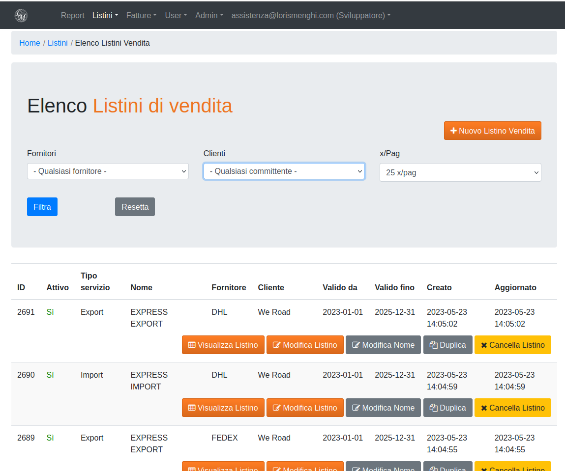 Si possono consultare i listini vendita già assegnati al committente, o dalla vista della scheda cliente, oppure dalla sezione Listini del menù orizzontale e filtrare l'elenco per committente.