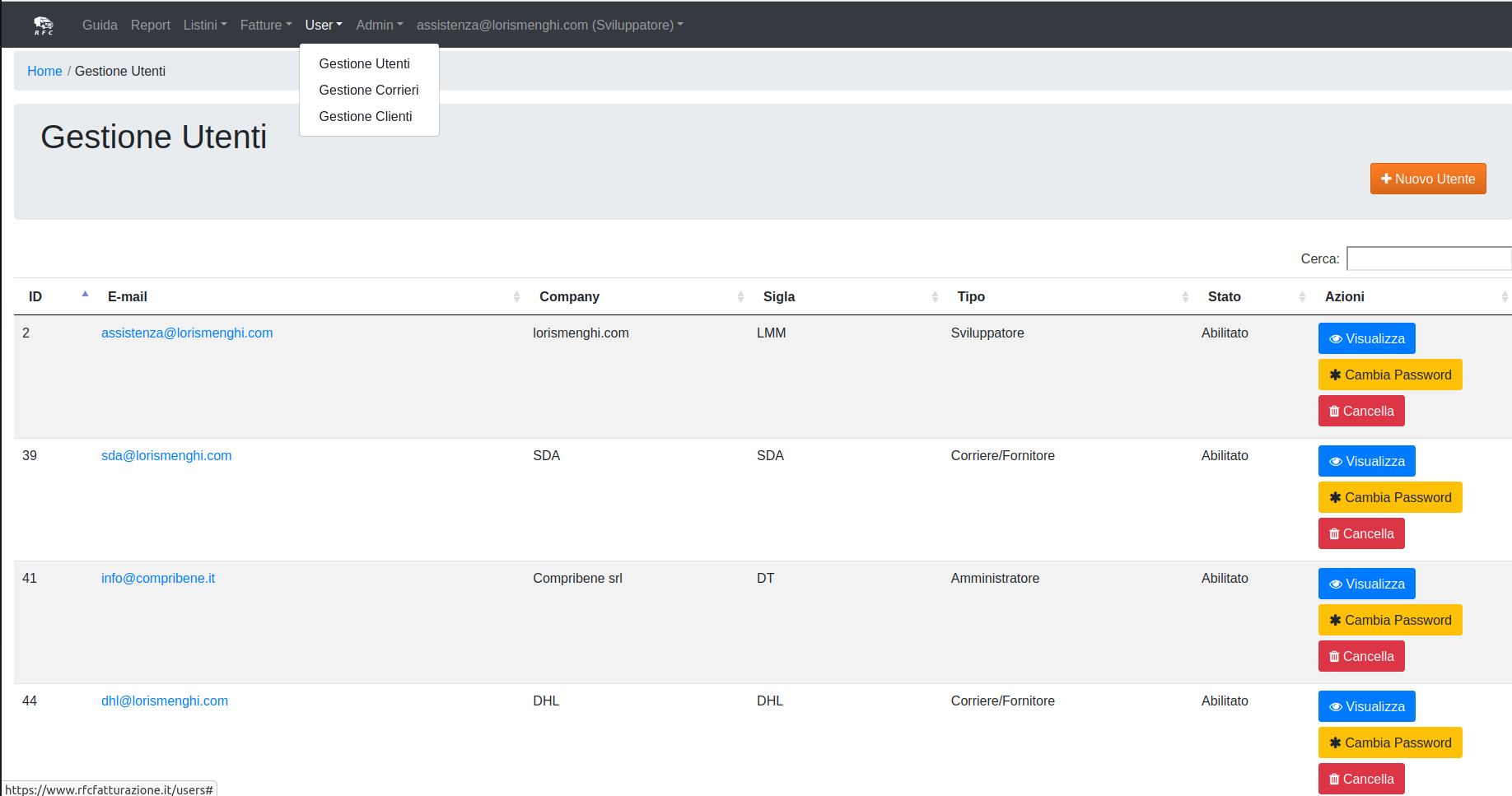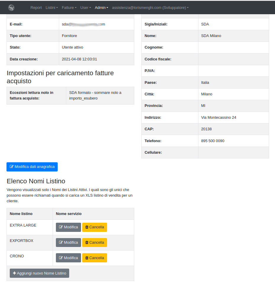 Appena salvato, il nuovo fornitore sarà visibile, sia nella pagina di elenco utenti generici, vista precedentemente, che nella pagina elenco dedicata ai fornitori (User -> Gestione corrieri).