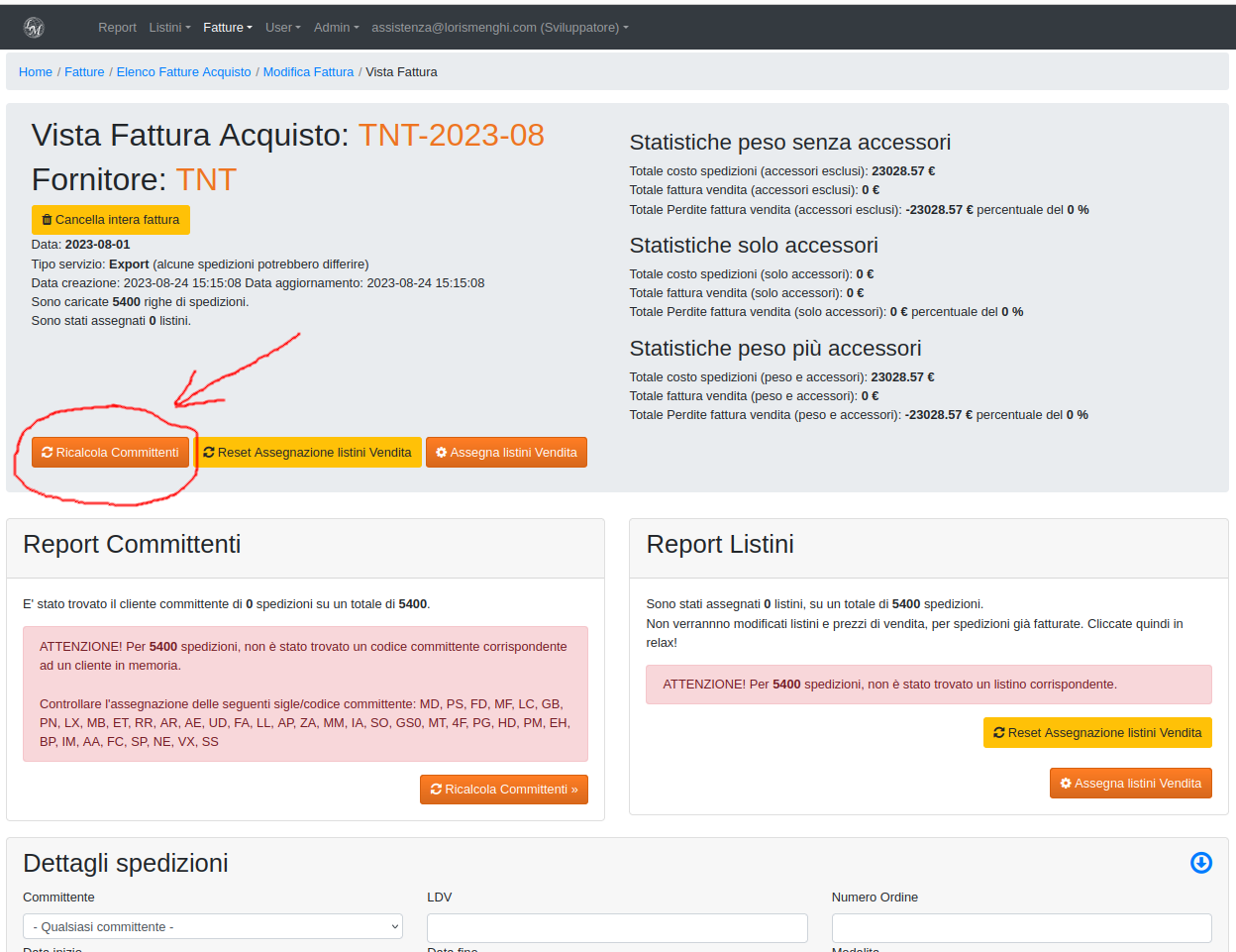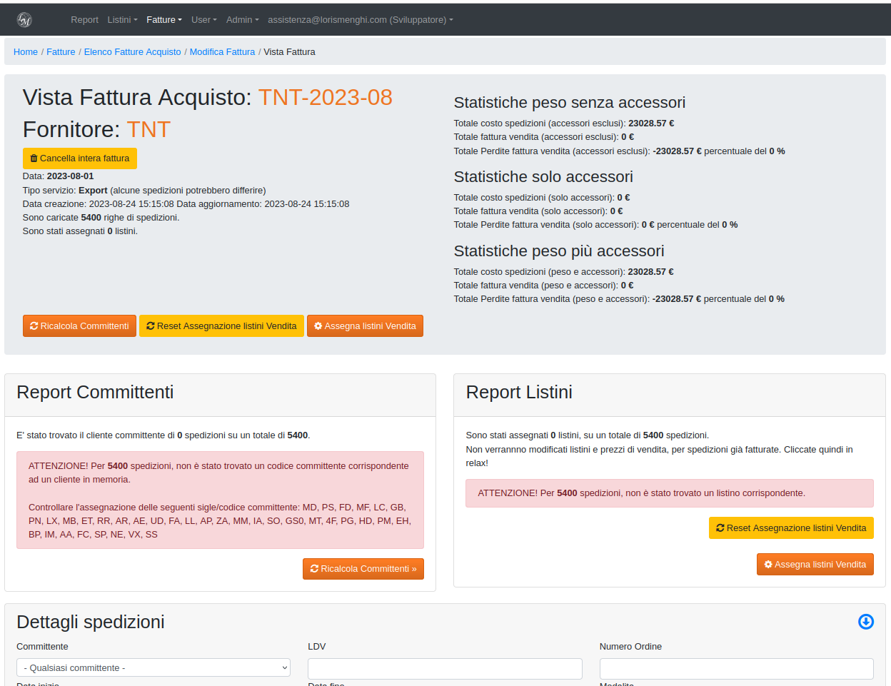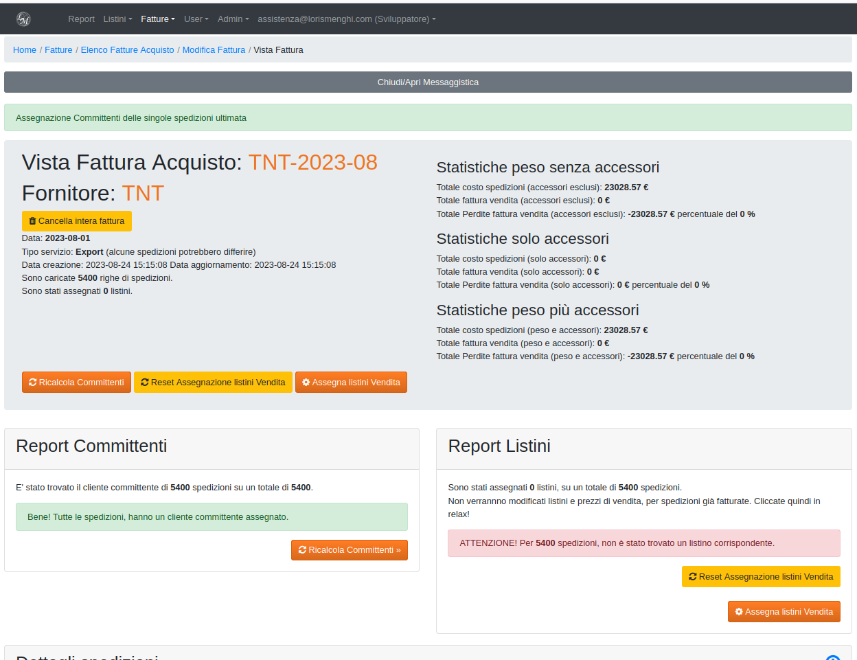 Nella pagina di modifica cliccando il pulsante "vedi dettaglio" ci rimanderà alla pagina di vista fattura che mostrerà tutte le spedizioni caricate e sarà l'ambiente di lavoro per lo step successivo, associazione committenti e applicazione dei listini vendita per quel committente.
