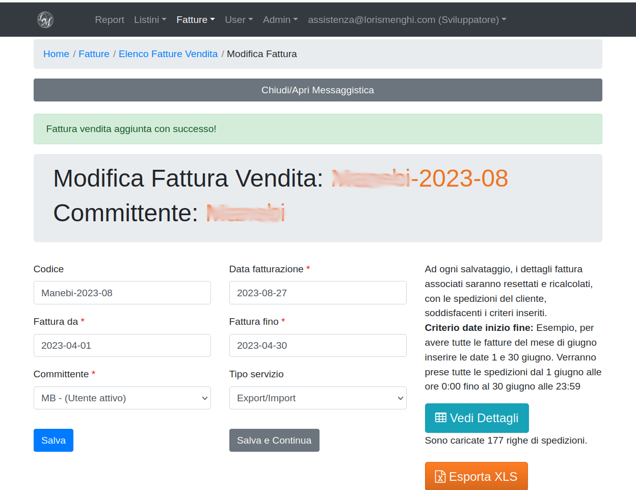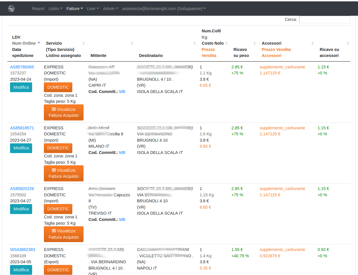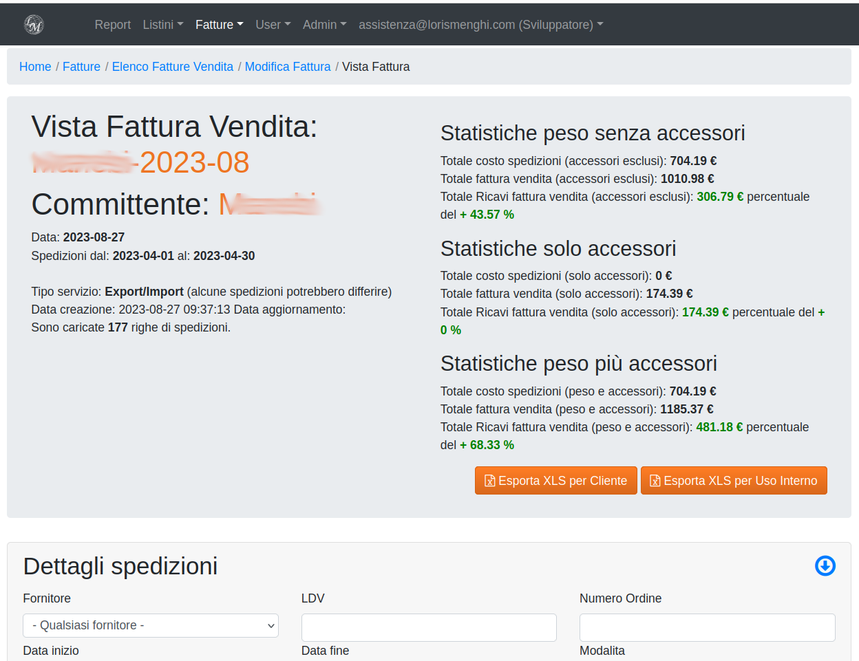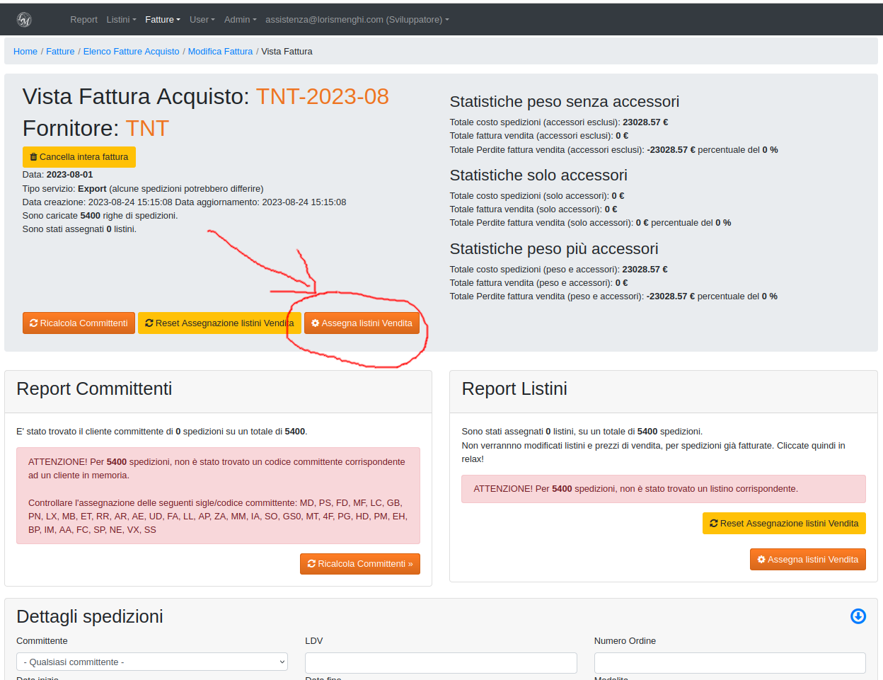 Nella pagina di modifica cliccando il pulsante "vedi dettaglio" ci rimanderà alla pagina di vista fattura che mostrerà tutte le spedizioni caricate e sarà l'ambiente di lavoro per lo step successivo, associazione committenti e applicazione dei listini vendita per quel committente.