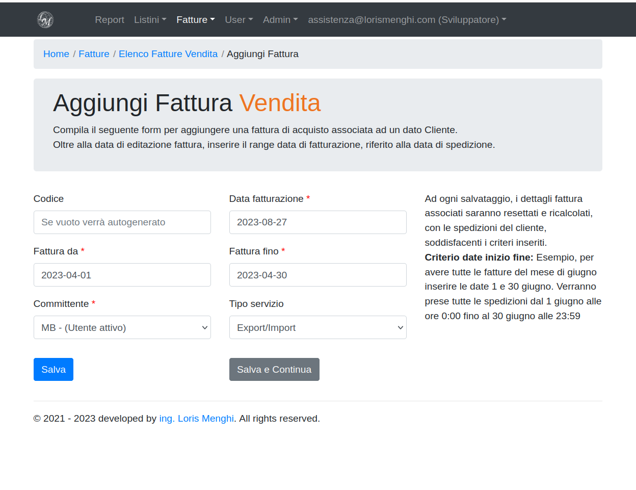 Mensilmente sarà sufficiente aprire la scheda del cliente committente, cliccare "aggiungi nuova fattura di vendita" selezionare il periodo e il sistema troverà tutte le spedizioni pertinenti.