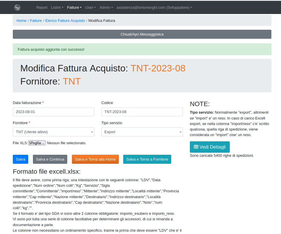 Ogni mese il fornitore/corriere delle spedizioni: SDA, TNT ecc.. fornirà un excell con tutte le spedizioni effettuate, tale excell andrà formattato per essere caricato nel sistema.