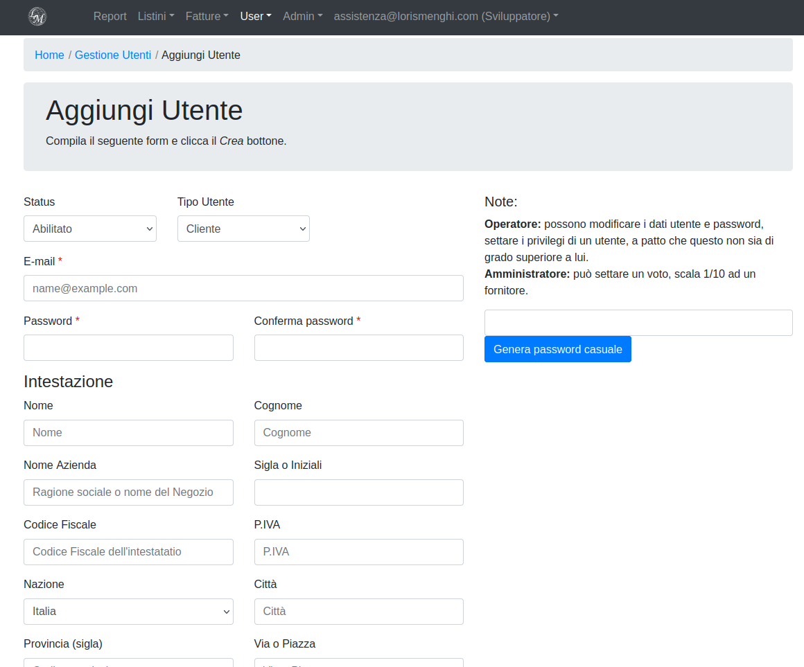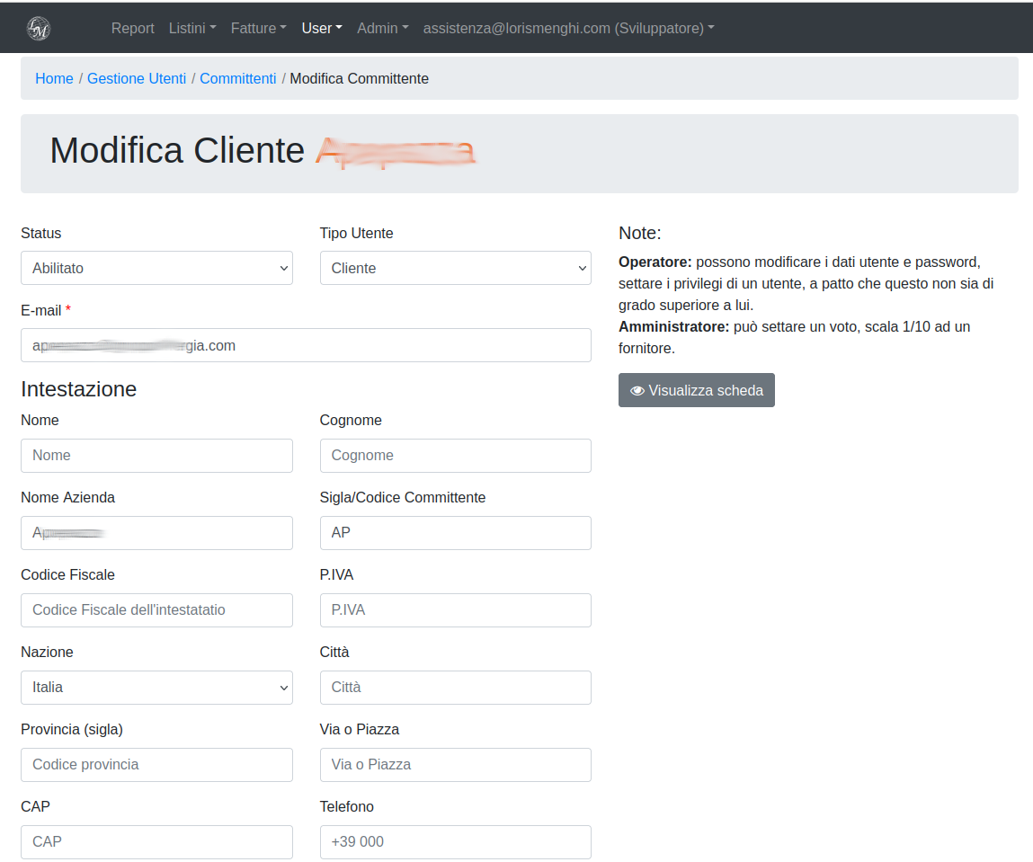 Appena salvato, il nuovo cliente sarà visibile, sia nella schermata elenco utenti generica, vista precedentemente, che nella schermata elenco dedicata ai fornitori/corrieri (User -> Gestione committenti).
