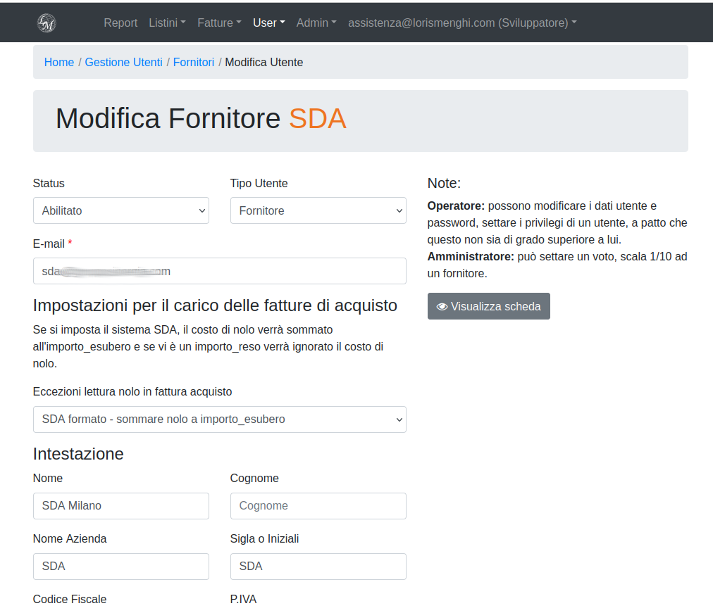 Appena salvato l'utente come fornitore/corriere, nella pagina di modifica appariranno delle opzioni dedicate, esempio il campo "eccezione lettura nolo" in fattura acquisto.